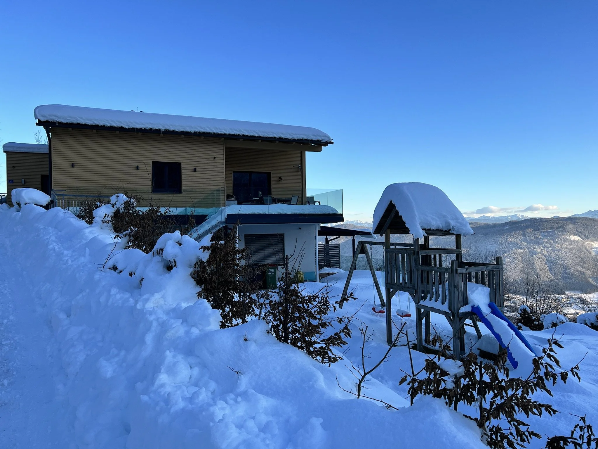 Große Terrasse mit Sonnenliegen und überdachtem Essbereich
